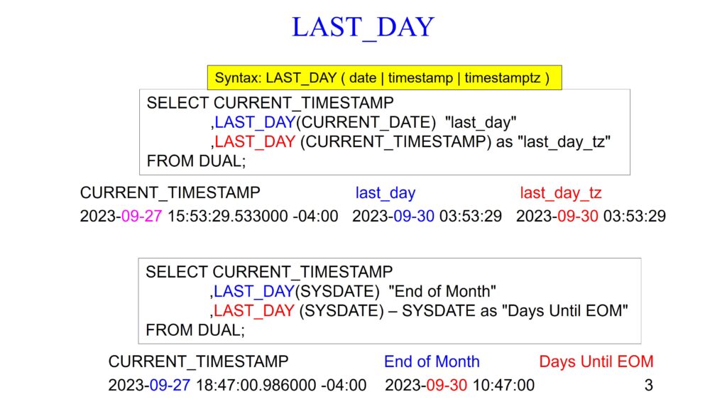 The first query below uses the LAST_DAY function to find the last day of the month for both the current date (CURRENT_DATE) and the current timestamp (CURRENT_TIMESTAMP). The second query below uses the LAST_DAY function to find the last day of the month for the SYSDATE. Additionally, the second query calculates the number of days until the end of the month by subtracting the system date (SYSDATE) from the last day of the month.