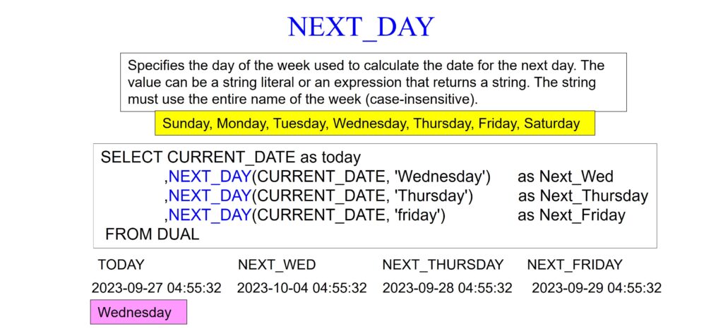 The NEXT_DAY function in Oracle is used to find the date of the next occurrence of a specified day of the week following a given date. It takes two parameters: a date expression representing the starting date and a day name specified as a string literal (‘Monday,’ ‘Tuesday,’ ‘Wednesday,’ ‘Thursday,’ ‘Friday,’ ‘Saturday,’ or ‘Sunday’) representing the target day of the week.