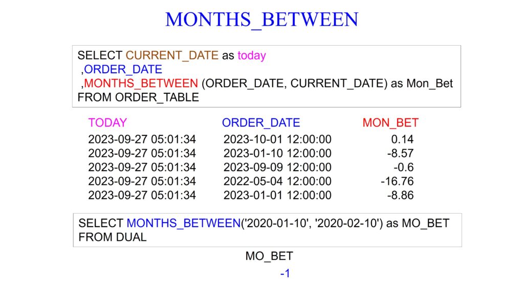 The MONTHS_BETWEEN function in Oracle calculates the number of months between two dates or timestamps. It takes two date or timestamp expressions as arguments and returns the difference in months between them. If the second date is later than the first date, the result is positive; if the second date is earlier, the result is negative. Notice the plus and minus dates in our query examples below.