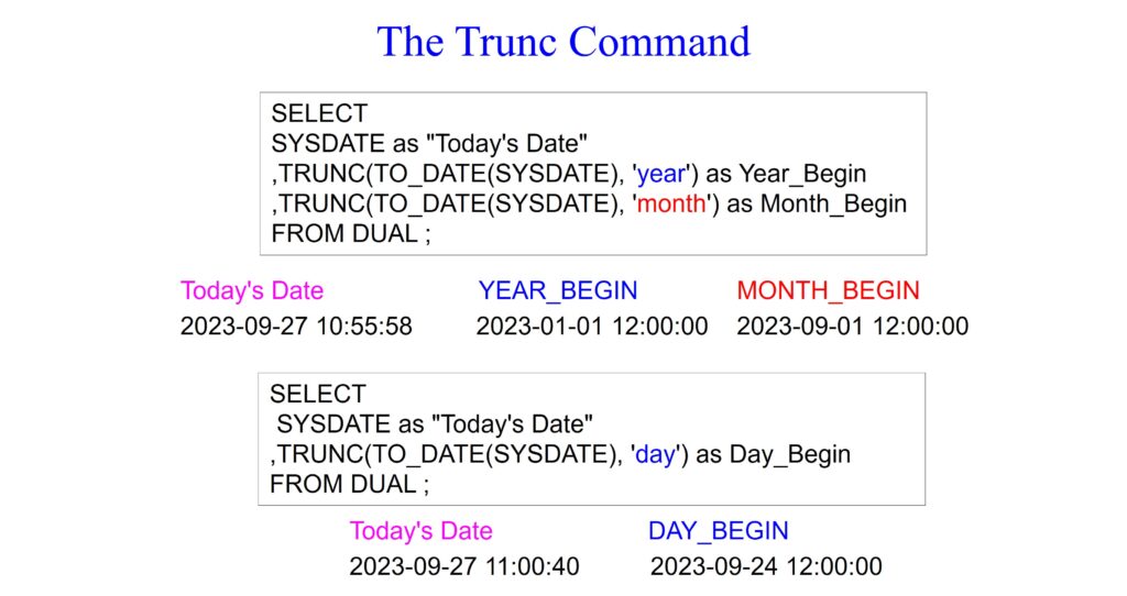 Both queries below utilize the TRUNC function to truncate the system date to different levels of precision (year, month, and day). The first query truncates it to the beginning of the year and the month, while the second query truncates the beginning of the week.