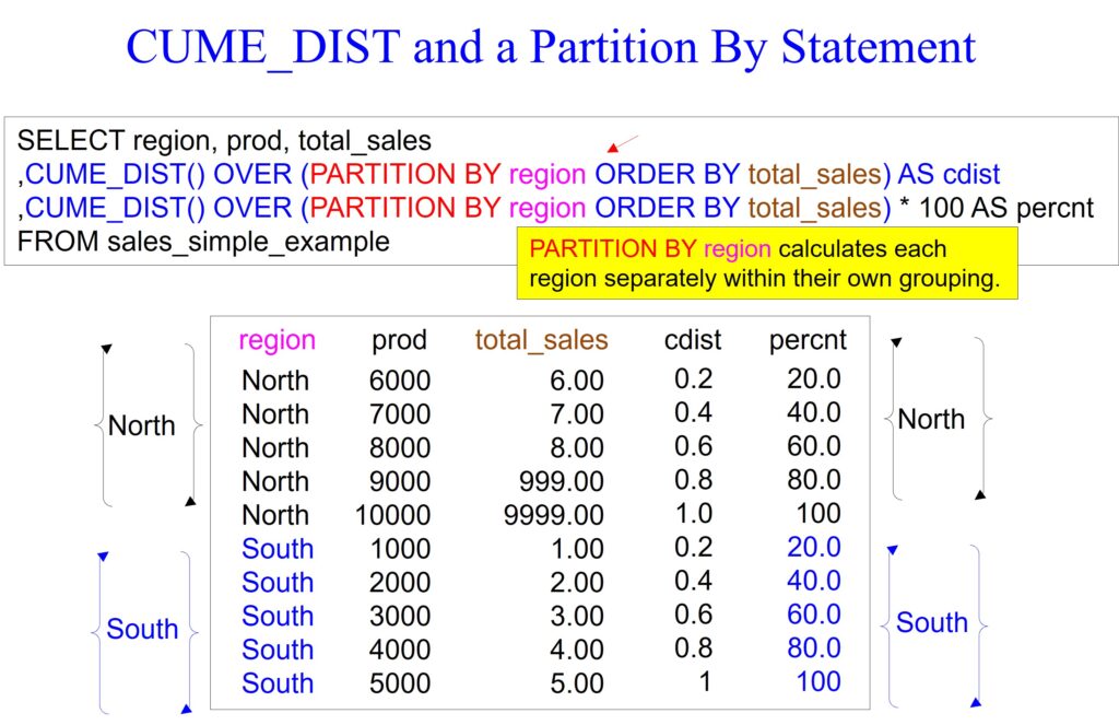 In the example below, we use the PARTITION BY command in column REGION. Since there are two regions, North and South, the CUME_DIST will calculate for only the North region and then reset and calculate the South region.