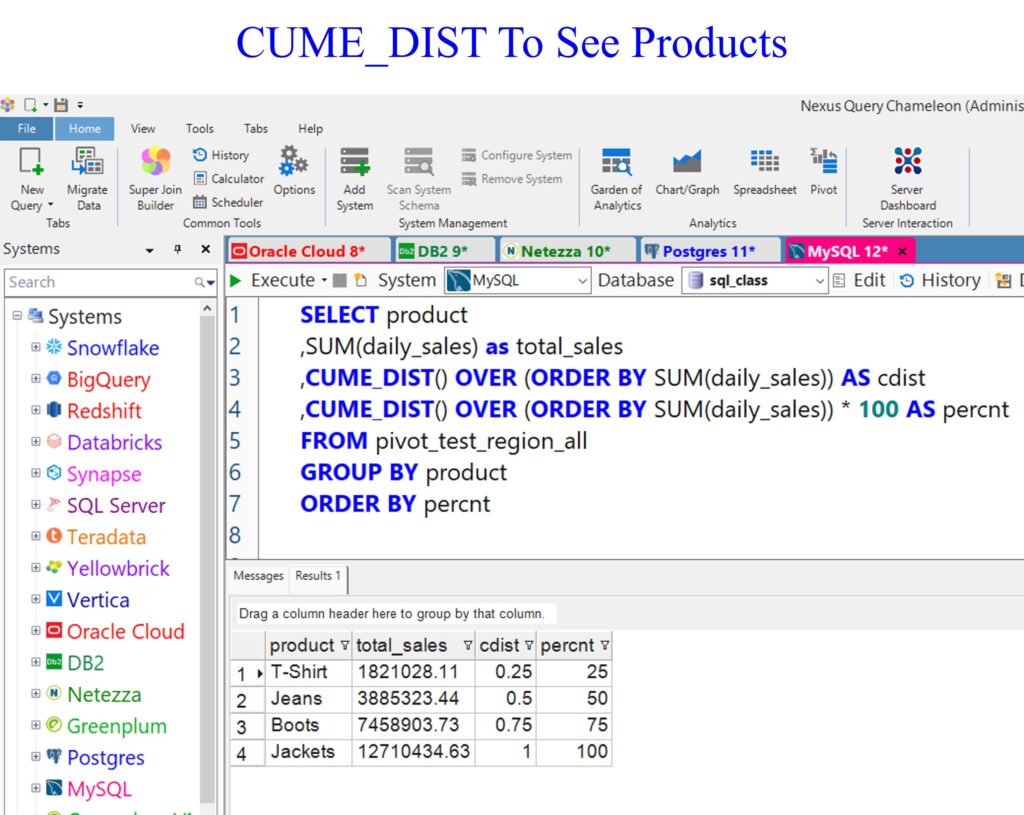 We also multiply the CUME_DIST calculation by 100 to provide a percentage, sometimes making the calculations easier to understand.