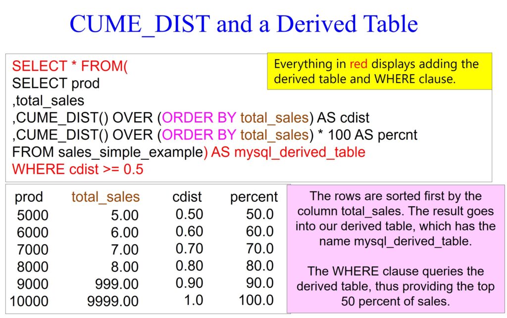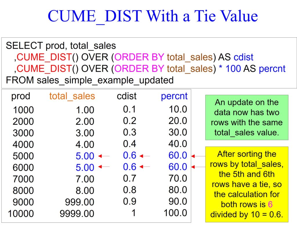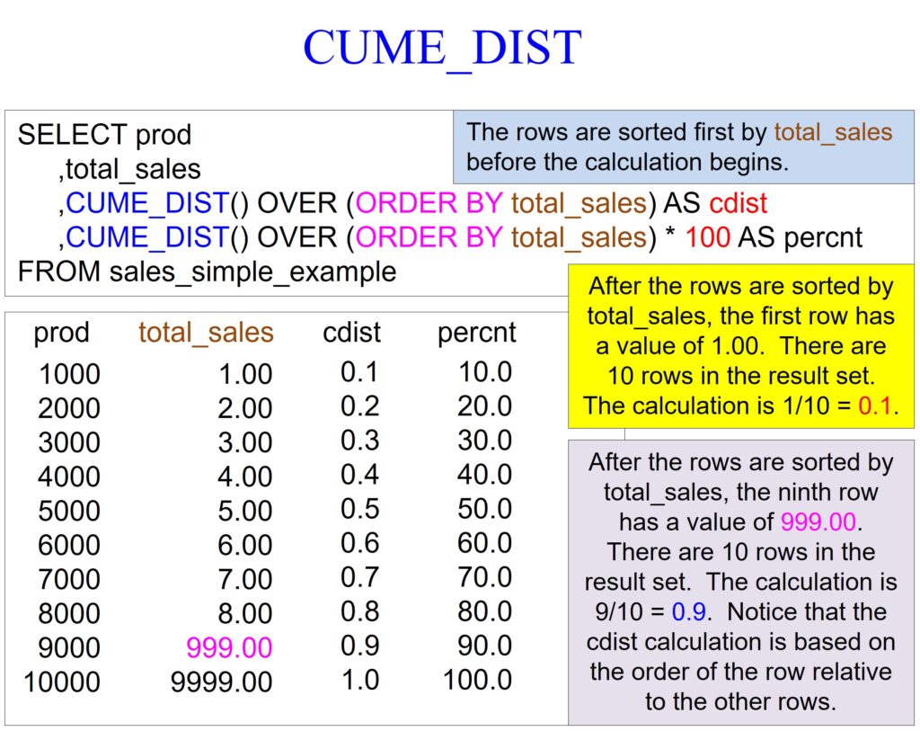 You will always have the keyword OVER, meaning the system will perform the CUME_DIST function on an ordered set of values. So before the CUME_DIST function is performed, the system will use the ORDER BY total_sales statement to sort the rows by total_sales. The default of an ORDER BY is ascending mode, which is how the data is sorted.