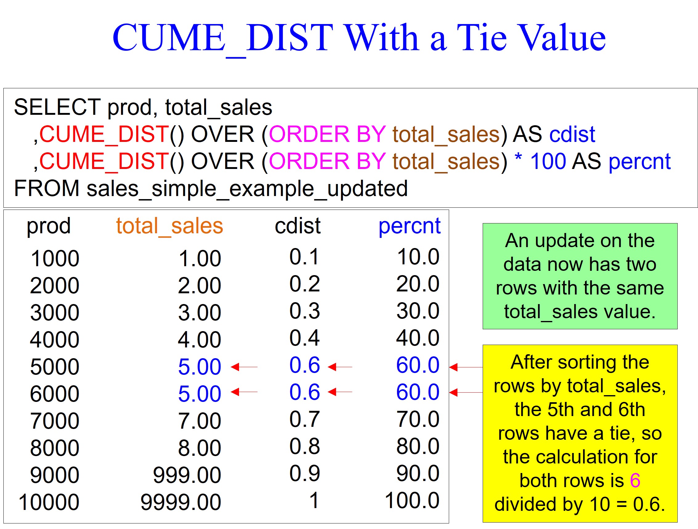 The next example below shows two duplicate values for TOTAL_SALES, 5.00, for rows five and six. The calculation for those rows with duplicate values is six divided by ten rows, which is 0.6. In other words, 6 / 10 = 0.6. We derived at six because the fifth and sixth rows are tied, and there are ten rows in total, so it is six divided by ten.