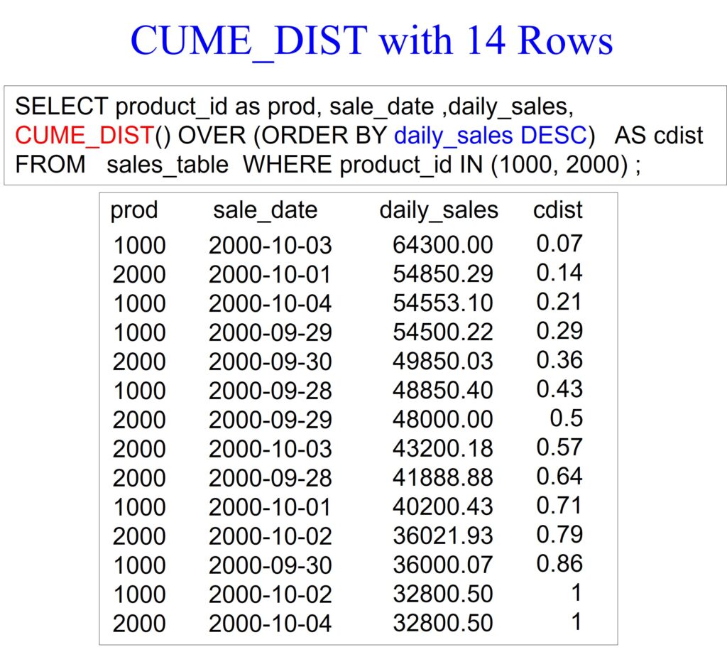 The CUME_DIST function is an SQL analytic window function that calculates the cumulative distribution of a value within a group of values. CUME_DIST provides a straightforward way of analyzing sales distribution across different products.