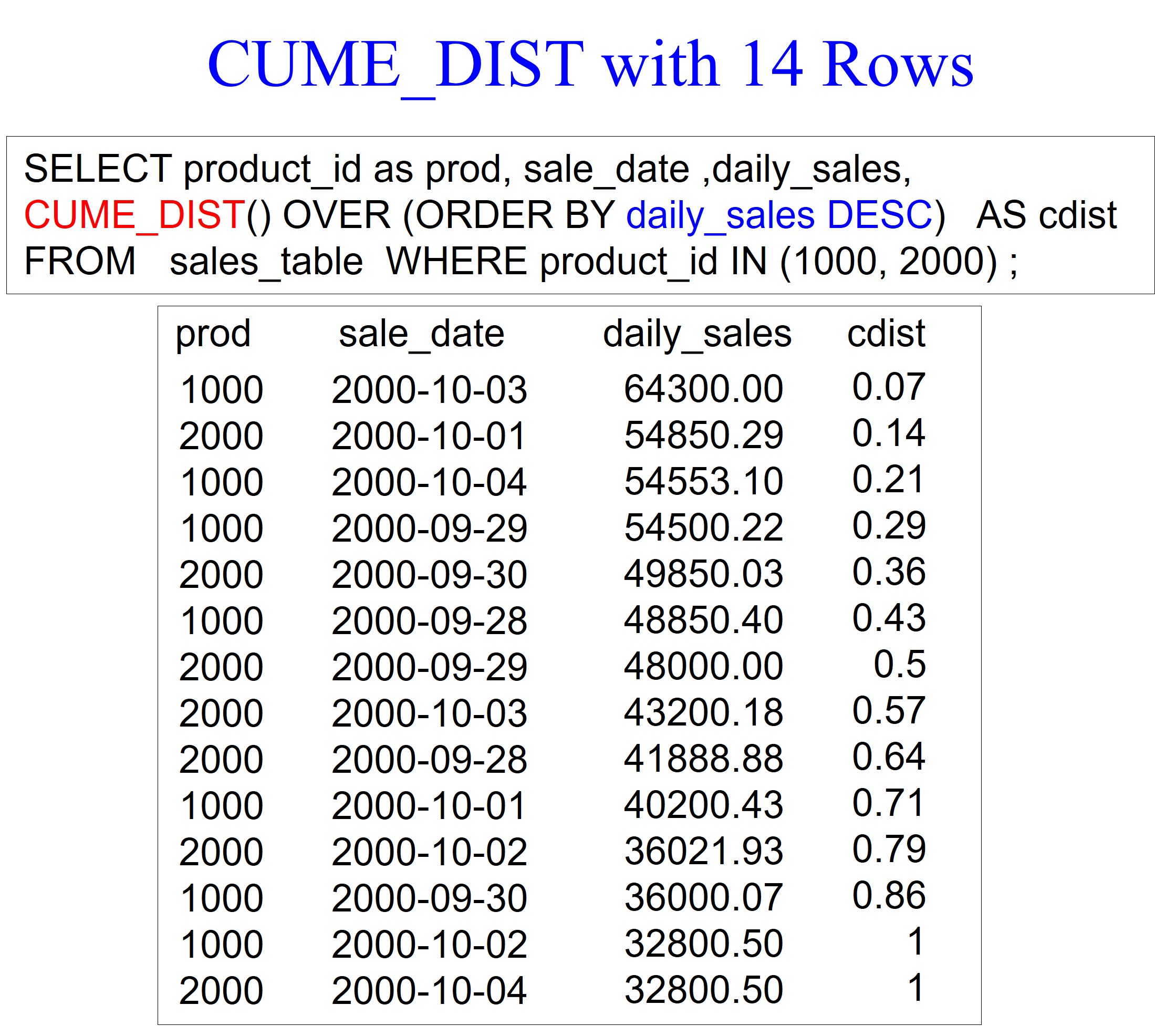 The example shows a CUME_DIST calculation on 14 rows, so the first row after the data is sorted by daily_sales DESC is calculated as one divided by 14, which results in 0.07. The next row is calculated by two divided by 14, which results in 0.14. Notice that rows 13 and 14 have a tie, so they are calculated as 14 divided by 14, which results in one.
