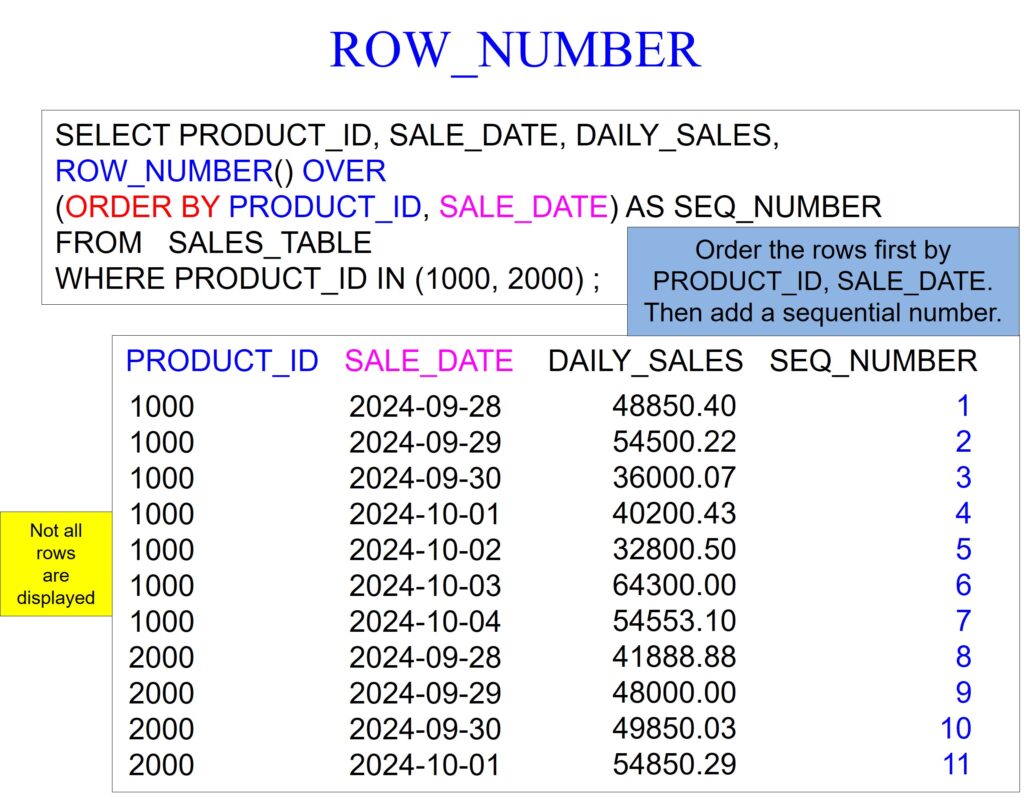 Our example below first orders the data by a major sort of product_id and then a minor sort of sale_date. Notice we see in the result set the product_id of 1000 and within 1000 sequential dates in order. Only after the data is ordered does the row_number place a number starting from one on the first row and incrementing by one until the last. These types of analytics are often referred to as ordered analytics because they order the data before the analytics runs.