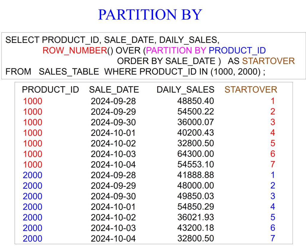 Our next example uses a PARTITION BY statement, which means performing the analytic within each product_id separately. I like to think of it as resetting the row_number with the beginning of each product_id. Notice that we are ordering the data by sale_date, but it appears we are ordering by product_id and then sale_date because of the combination of partitioning and ordering within the row_number analytic.