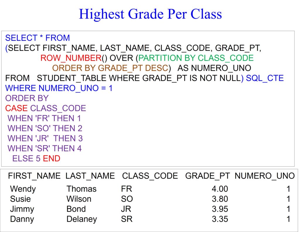 Now that you know what to look for, the example below should be easy on your brain and your eyes. We partition by the class_code and order by the grade_pt in descending order. We also use a WHERE clause to filter out grade_pt null values. We then place our row_number query inside a derived table, which I have colored in blue, often referred to as a common table expression (CTE). I have also done a final ORDER BY using a CASE statement to order the answer set logically instead of alphabetically.
