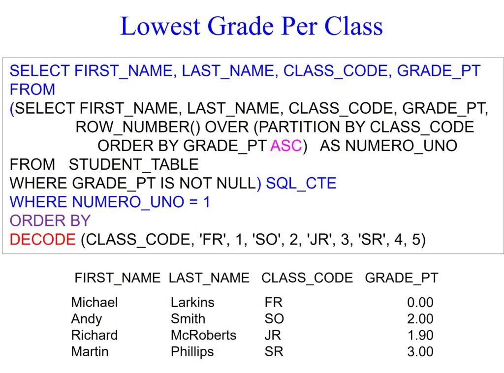 We have made a few changes in our example below to return the lowest grade averages per class_code. The most important detail is that we are now ordering the data by grade_pt in ascending mode. We place our row_number query inside a derived table I have colored in blue. We can then use a WHERE clause to filter out rows that do not receive a row_number of one. We only select columns we want on the final report in our top SELECT statement without selecting the row_number on the report. I have also done a final ORDER BY using a decode statement to order the answer set logically instead of alphabetically.