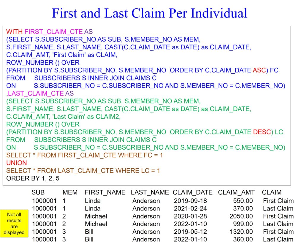 The example below uses clever techniques to find the first and last claim filed per individual. We have created two derived tables using the WITH technique to accomplish the request. Notice the keyword WITH is only used once, but I have the names of both derived tables colored in pink. I have also colored the first derived table blue and the second green.