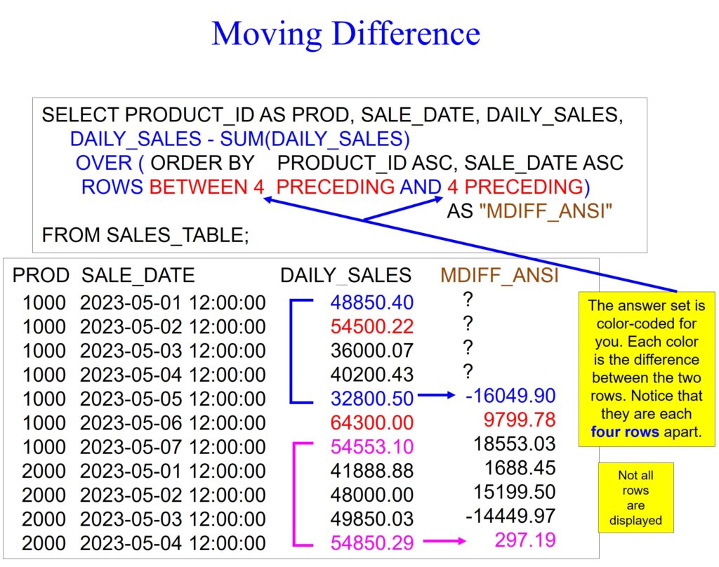 Notice that the fifth row has a value of -16409.90. We are only comparing the DAILY_SALES value in row one with the DAILY_SALES value in row five because we have a moving window of four because of the keywords ROWS BETWEEN 4 PRECEDING AND 4 PRECEDING. I have colored those values in blue. Notice that we compared row two with row six (four rows apart), and we did better by 9,799.78 dollars, colored in red.
