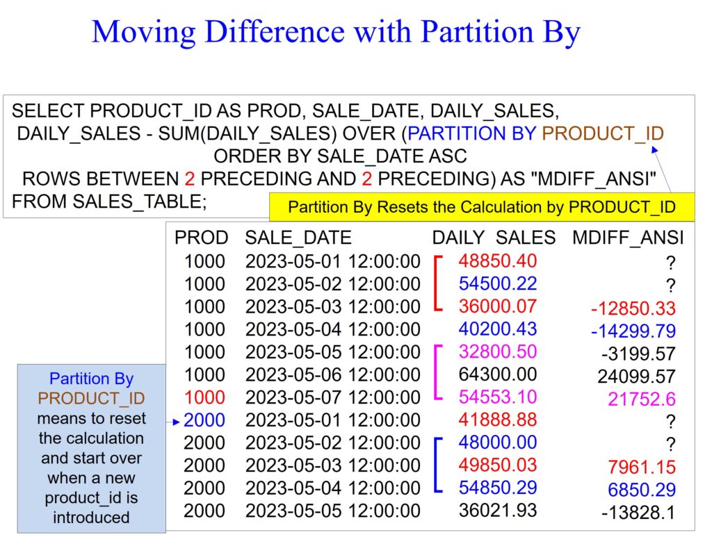 The example below has two differences from the previous examples. The first difference is the PARTITION BY PRODUCT_ID statement within the moving difference calculation. PARTITION BY PRODUCT_ID means performing the moving difference calculation within each product ID. In other words, with each product ID break, we will begin the calculation again.