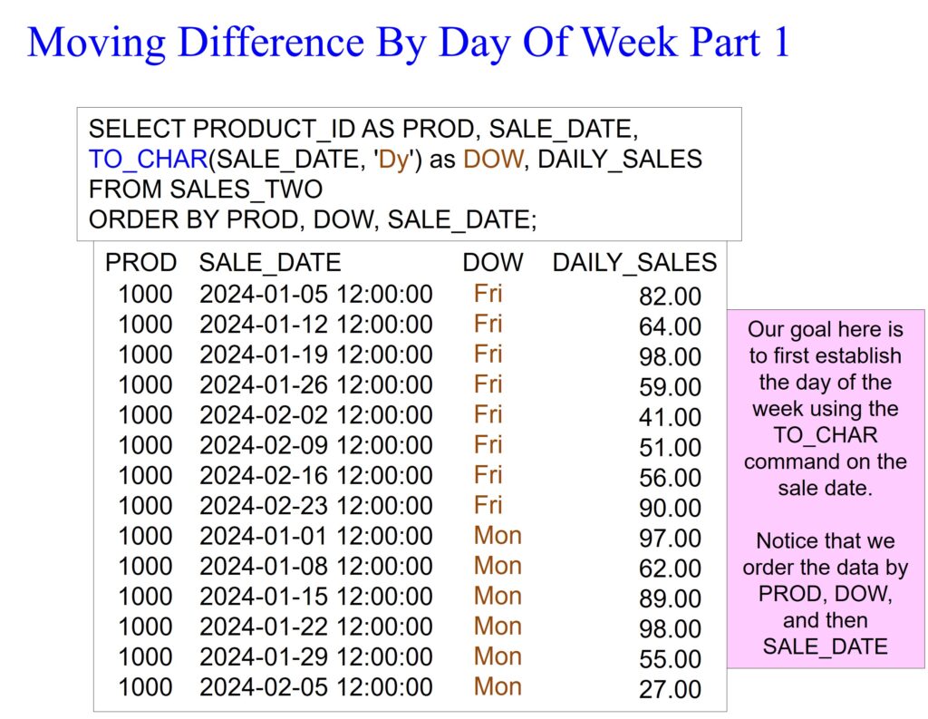 The first part will not involve the moving difference; instead, merely add the day of the week using the TO_CHAR format command on the SALE_DATE. Notice that I am using an ORDER BY PROD, DOW, SALE_DATE at the end of the query. I am showing you the ordering of the data I will use in my moving difference calculation. I am ordering the data so each product_id has the same days of the week in chronological order. The example below shows all of the Fridays from the first sale to the last sale. And then all the Mondays from the first to the last sale.