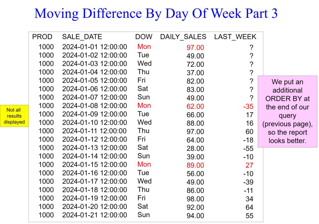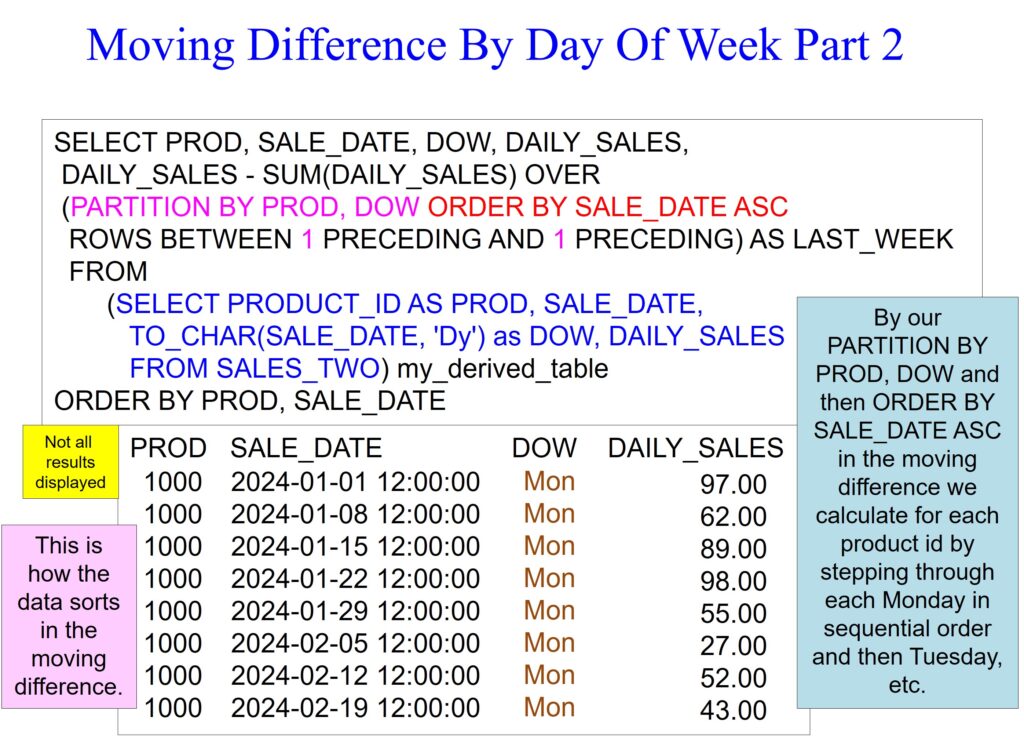 Notice that all Mondays are chronologically bunched together, each one row apart. The moving difference will first be the Mondays comparing each row with the previous row; in other words, it will compare Monday’s DAILY_SALES with the previous Monday for product ID 1000. I guarantee that only Mondays will compare to Mondays within their partition, and then Tuesdays will compare with Tuesdays within their partition, etc.