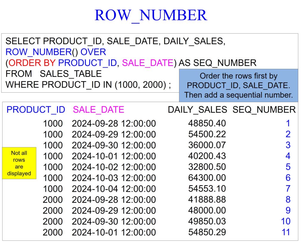 Our example below first orders the data by a major sort of product_id and then a minor sort of sale_date. Notice we see in the result set the product_id of 1000 and within 1000 sequential dates in order. Only after the data is ordered does the row_number place a number starting from one on the first row and incrementing by one until the last. These types of analytics are often referred to as ordered analytics because they order the data before the analytics runs.
