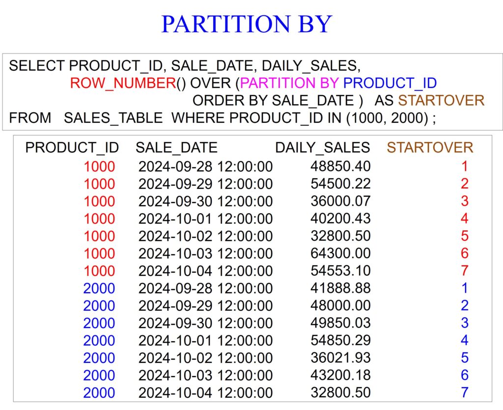 Our next example uses a PARTITION BY statement, which means performing the analytic within each product_id separately. I like to think of it as resetting the row_number with the beginning of each product_id. Notice that we are ordering the data by sale_date, but it appears we are ordering by product_id and then sale_date because of the combination of partitioning and ordering within the row_number analytic.