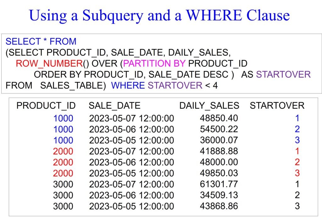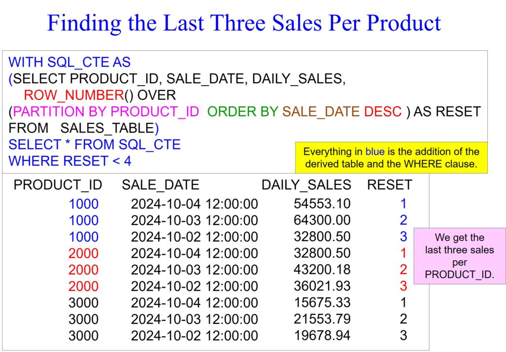 Our example returns the last three sales per product_id, demonstrating the power of a derived table. A WHERE clause filters before calculations or analytics run, so we place our query inside parenthesis to create a derived table. I have placed everything you need to create a derived table and query it with a WHERE clause in blue.