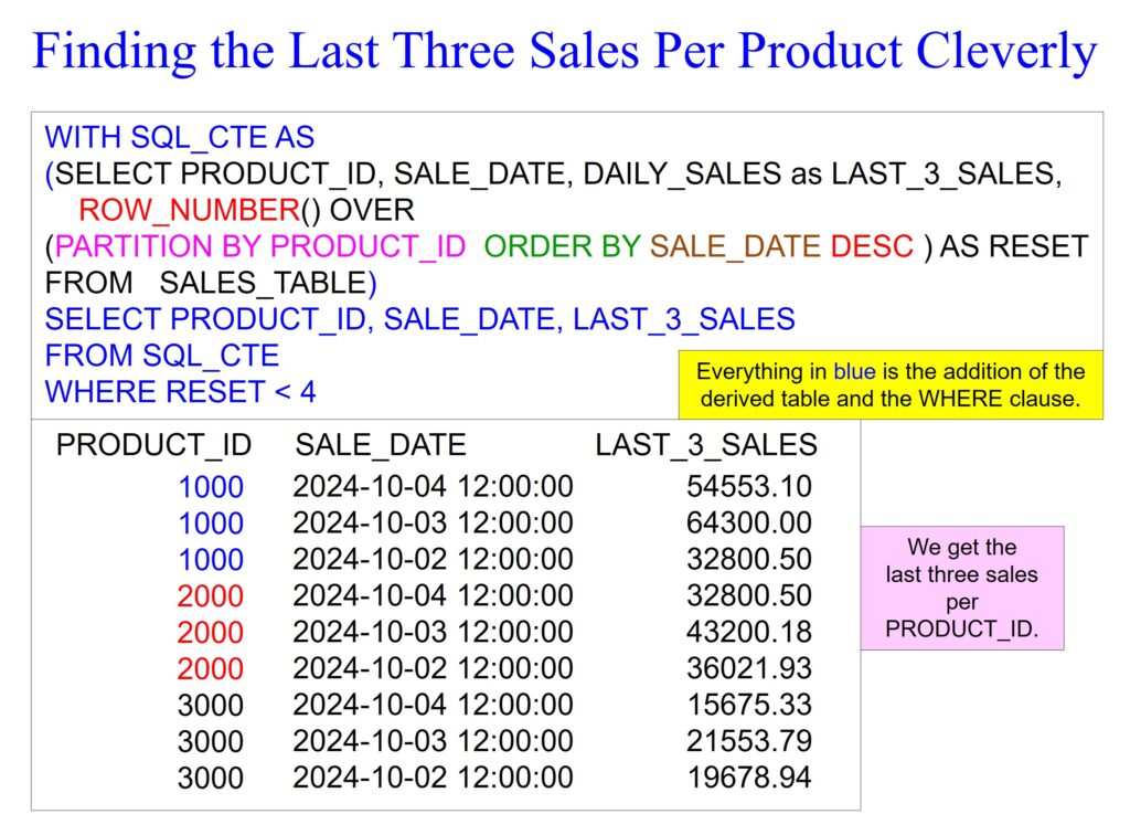 We then have a WHERE clause outside the subquery to trim the rows to include only the last three sales per product_id.