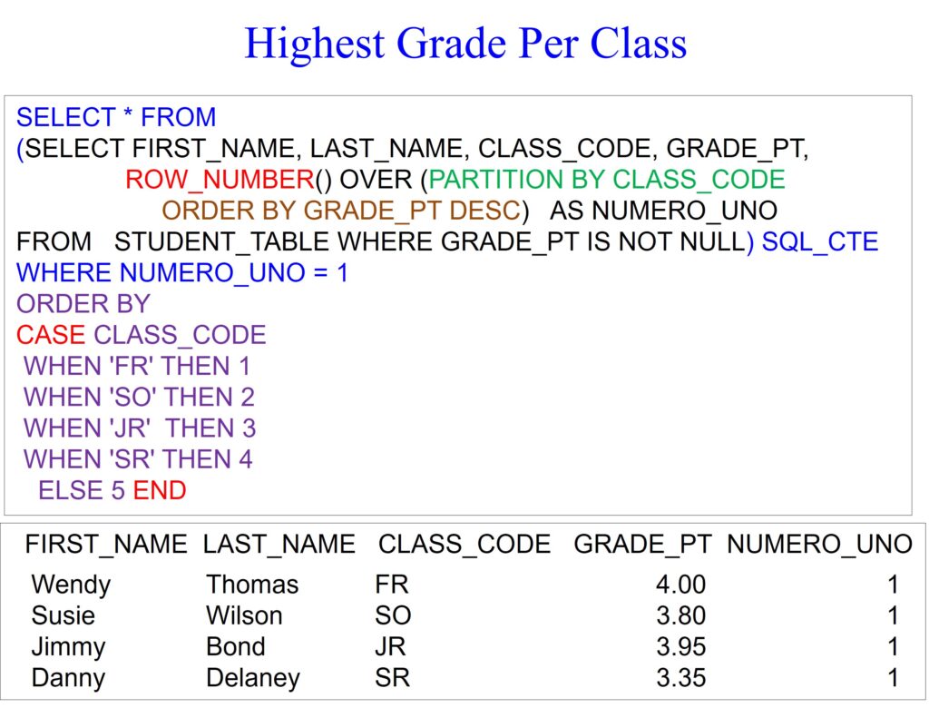 Now that you know what to look for, the example below should be easy on your brain and your eyes. We partition by the class_code and order by the grade_pt in descending order. We also use a WHERE clause to filter out grade_pt null values. We then place our row_number query inside a derived table, which I have colored in blue, often referred to as a common table expression (CTE). I have also done a final ORDER BY using a CASE statement to order the answer set logically instead of alphabetically.