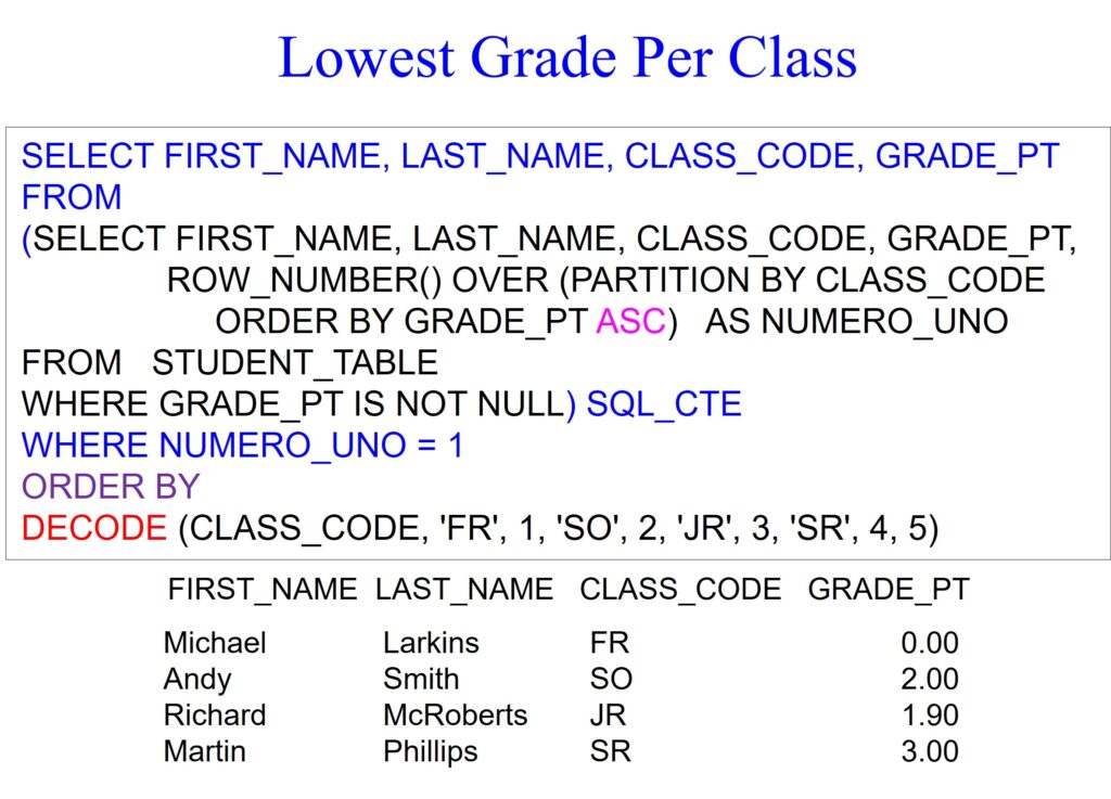 We have made a few changes in our example below to return the lowest grade averages per class_code. The most important detail is that we are now ordering the data by grade_pt in ascending mode. We place our row_number query inside a derived table I have colored in blue. We can then use a WHERE clause to filter out rows that do not receive a row_number of one. We only select columns we want on the final report in our top SELECT statement without selecting the row_number on the report. I have also done a final ORDER BY using a decode statement to order the answer set logically instead of alphabetically.