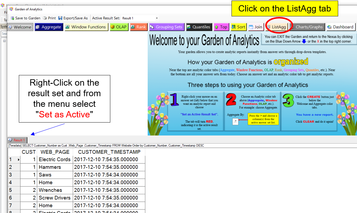 When you enter the Garden of Analytics, you must set your result set as the “Active ResultSet.” To do this, right-click on the result set and from the menu choose “Set as Active ResultSet.”