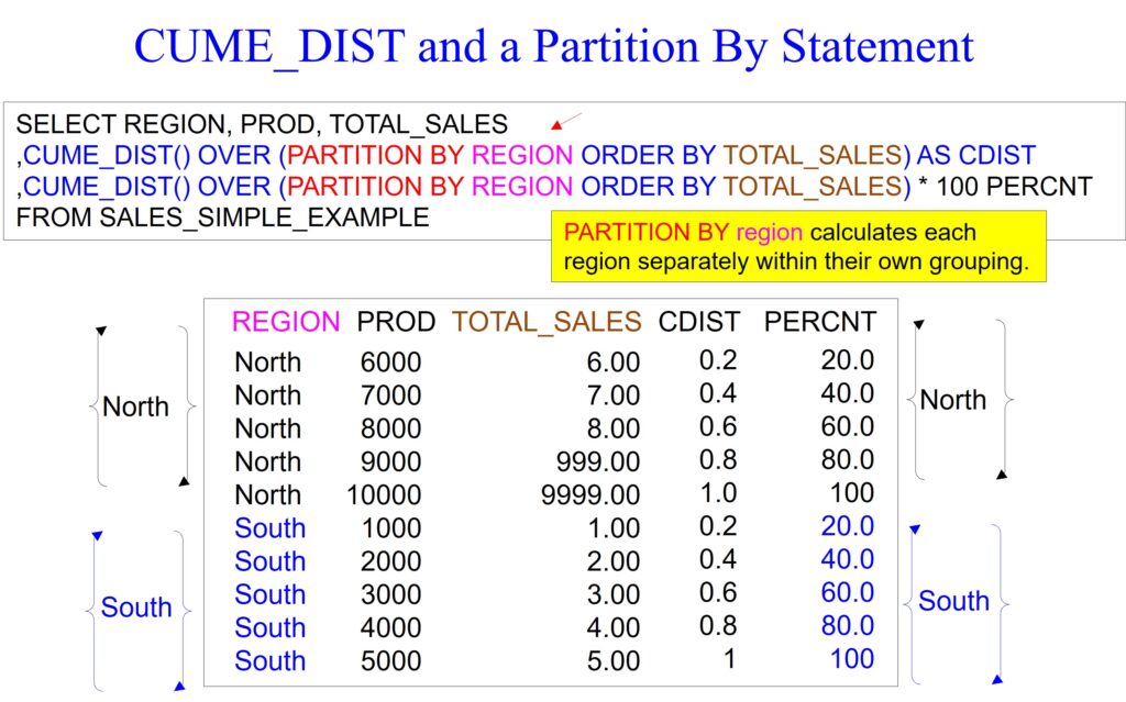 In the example below, we use the PARTITION BY command in column REGION. Since there are two regions, North and South, the CUME_DIST will calculate for only the North region and then reset and calculate the South region.