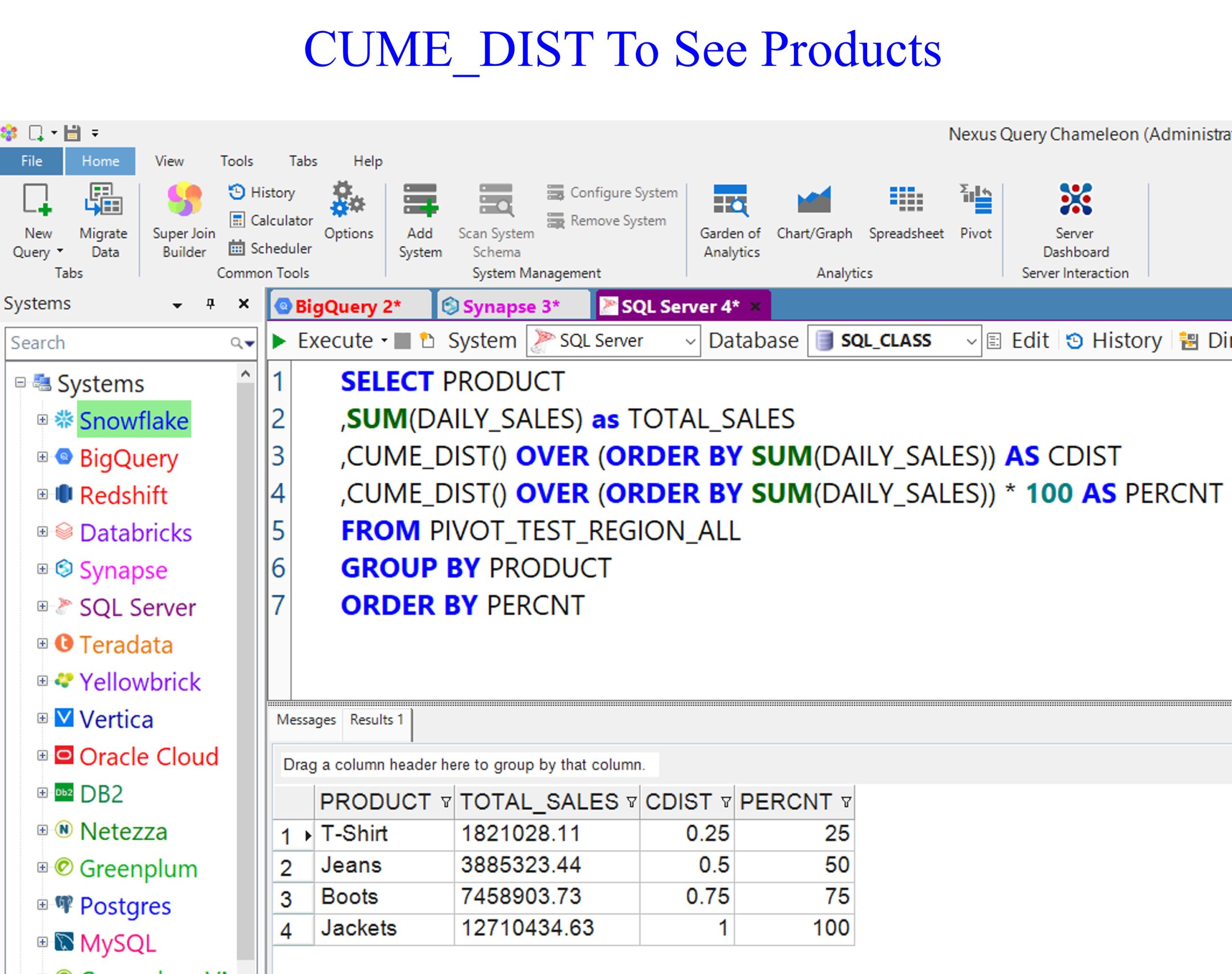 Below is a query that performs a sum of the daily_sales, which we alias total_sales. We then perform a CUME_DIST on the total_sales. Jackets are performing quite well, and T-shirts are our worst performers.