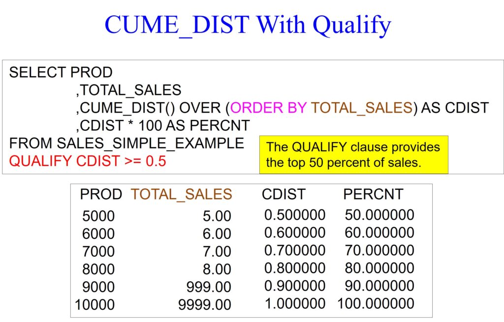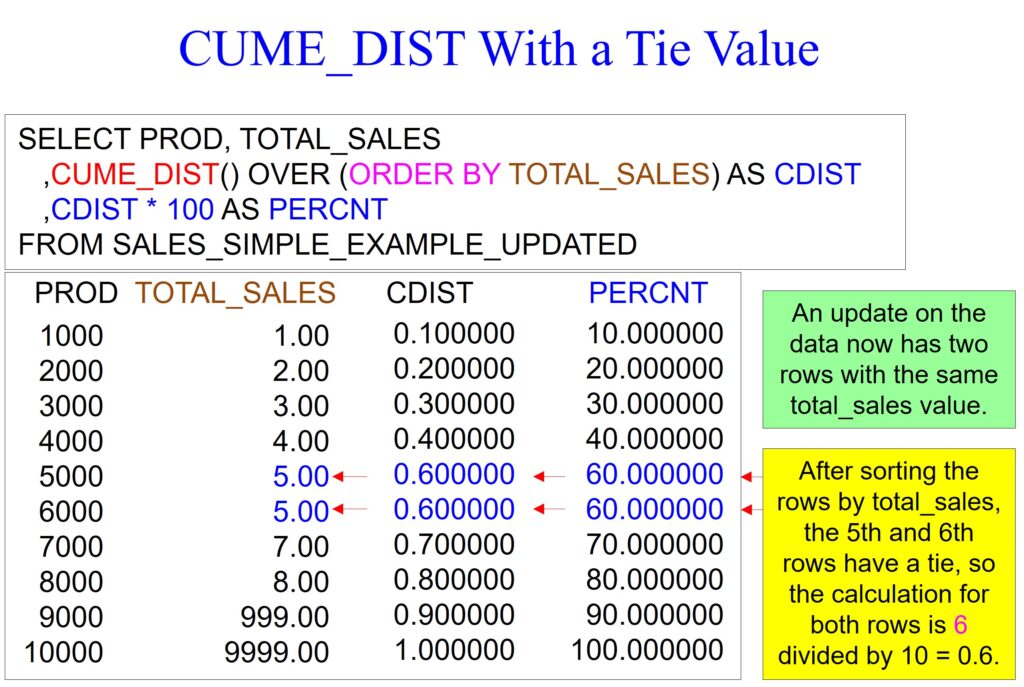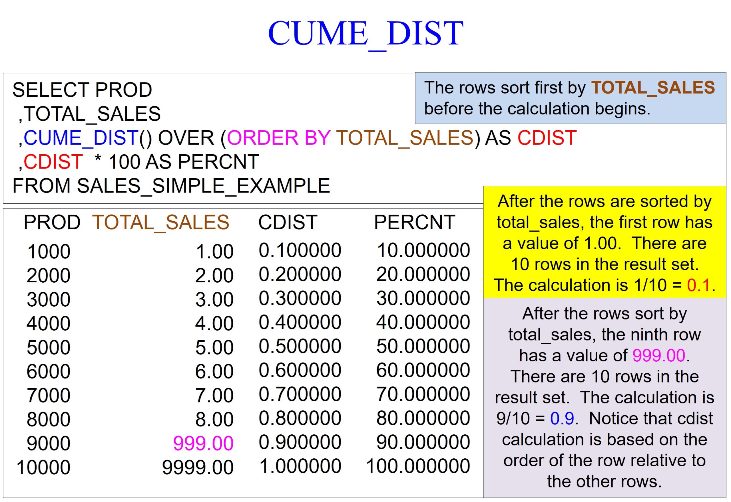 You will always have the keyword OVER, meaning the system will perform the CUME_DIST function on an ordered set of values. So before the CUME_DIST function is performed, the system will use the ORDER BY TOTAL_SALES statement to sort the rows by TOTAL_SALES. The default of an ORDER BY is ascending mode, which is how the data is sorted.