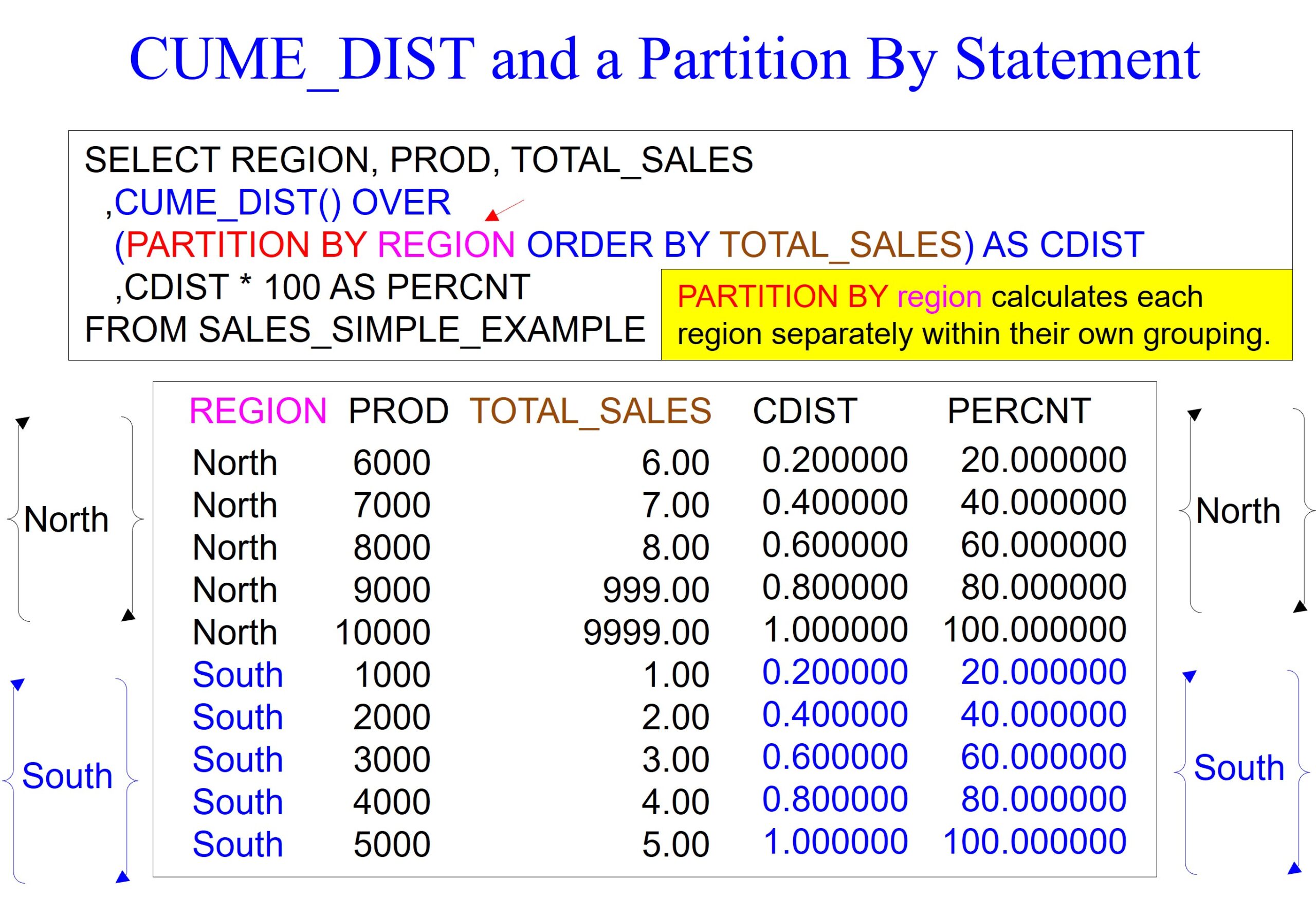 In the example below, we use the PARTITION BY command in column REGION. Since there are two regions, North and South, the CUME_DIST will calculate for only the North region and then reset and calculate the South region.