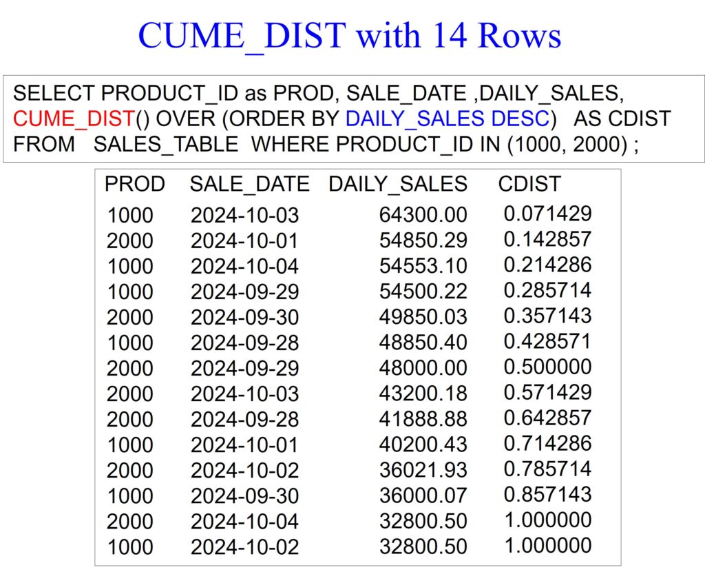 The example shows a CUME_DIST calculation on 14 rows, so the first row after the data is sorted by DAILY_SALES DESC is calculated as one divided by 14, which results in 0.07. The next row is calculated by two divided by 14, which results in 0.14. Notice that rows 13 and 14 have a tie, so they are calculated as 14 divided by 14, which results in one.