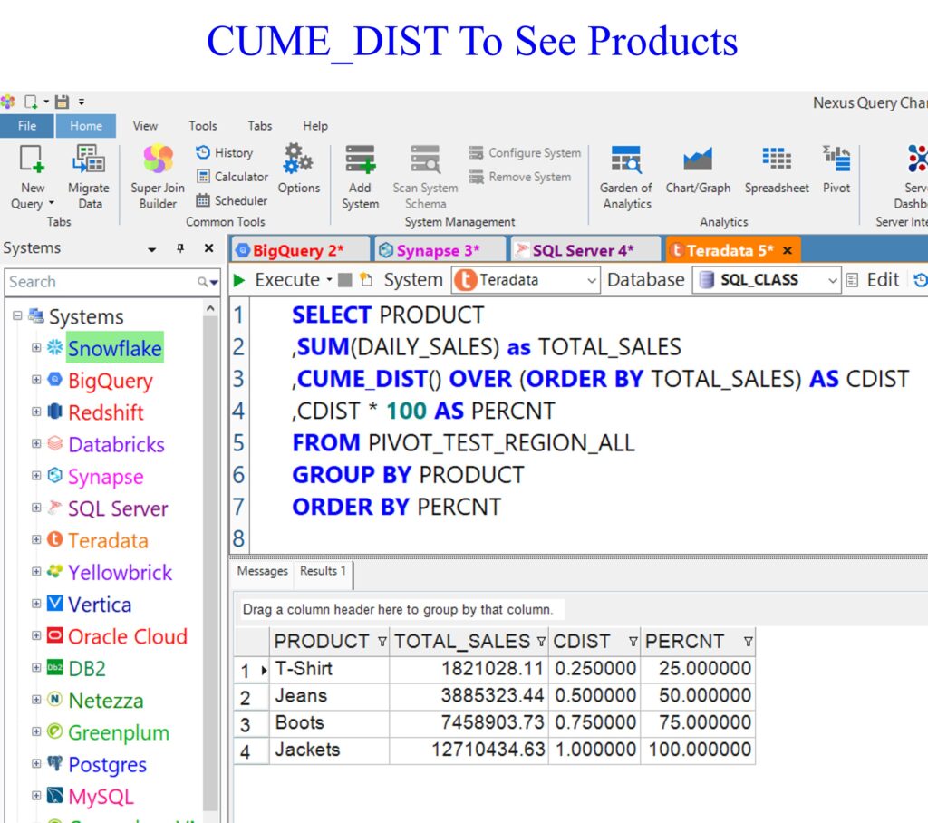 CUME_DIST is valuable for understanding product sales for many reasons. First of all, it helps to understand market positioning by providing figures of sales in comparison to others. The simplest explanation is that it identifies the high and low performers. How well a product has penetrated a market can also be revealed within a partition such as state, nation, region, etc.