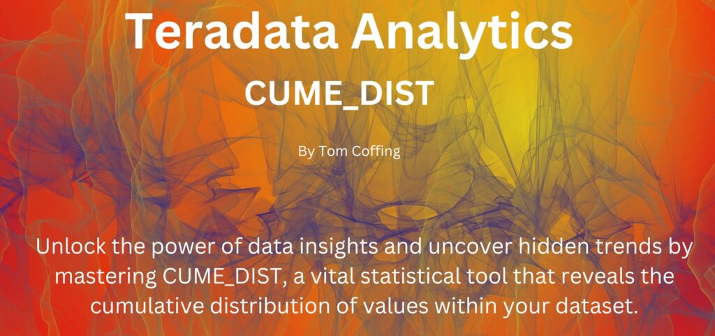 I can teach you analytics! Teradata is built for analytics, and this week, I will show you CUME_DIST, a not-so-distant cousin to RANK. You can now unlock the power of data insights and uncover hidden trends by mastering CUME_DIST, a vital statistical tool that reveals your dataset’s cumulative distribution of values.