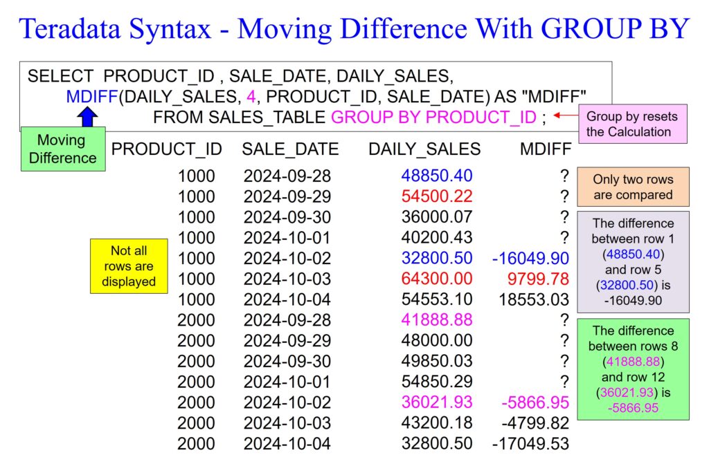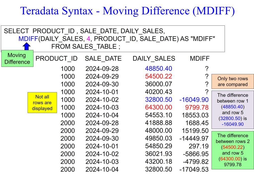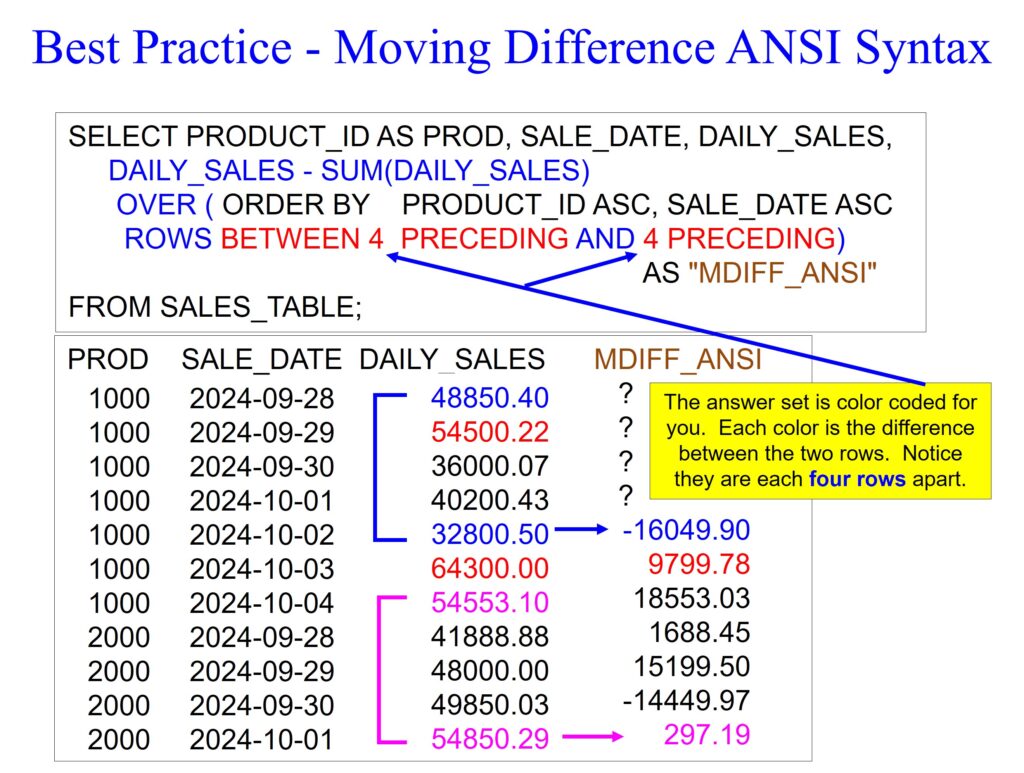 The example below is the best way to learn a Teradata moving difference because it uses ANSI syntax, meaning it will work on every database. The ANSI syntax is a little harder to understand initially, but it eventually becomes easy.