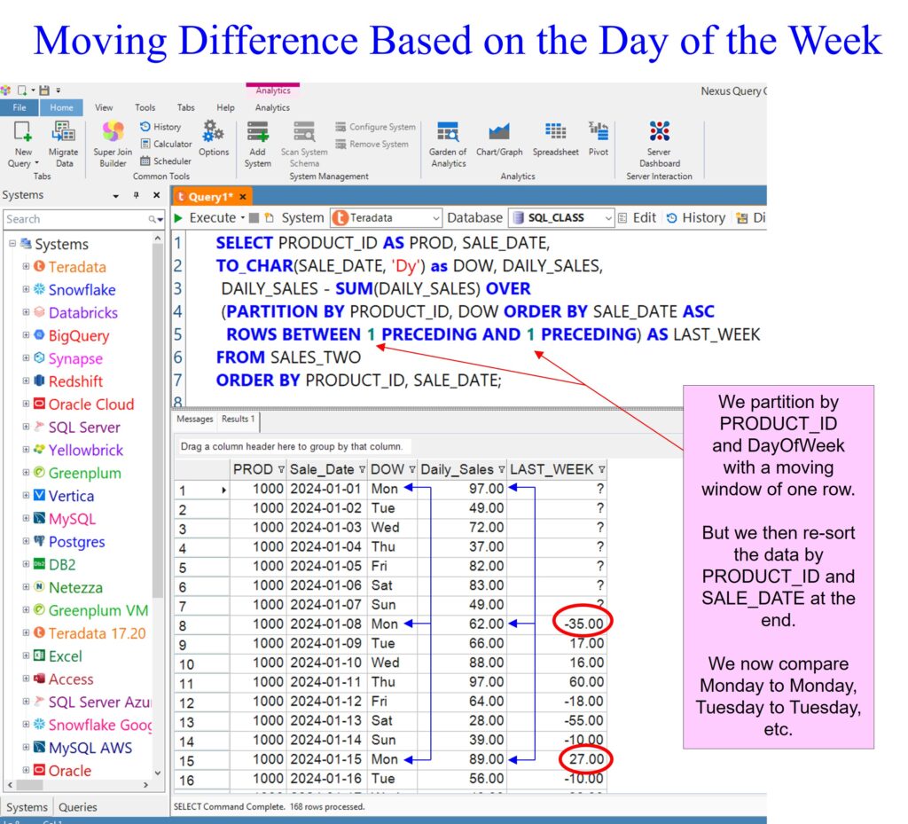 The moving difference calculation ordered the data by PRODUCT_ID and day of the week. The moving difference calculated Monday to the previous Monday, Tuesday to the previous Tuesday, etc. However, with the addition of the ORDER BY PRODUCT_ID SALE_DATE at the end, I resorted to it to make the report look nice. However, if you compare the first Monday, we made 97.00 to the second Monday, where we made 62.00, we did worse on the second Monday by 35.00. But we did better on the second Tuesday than the first Tuesday by 17.00.