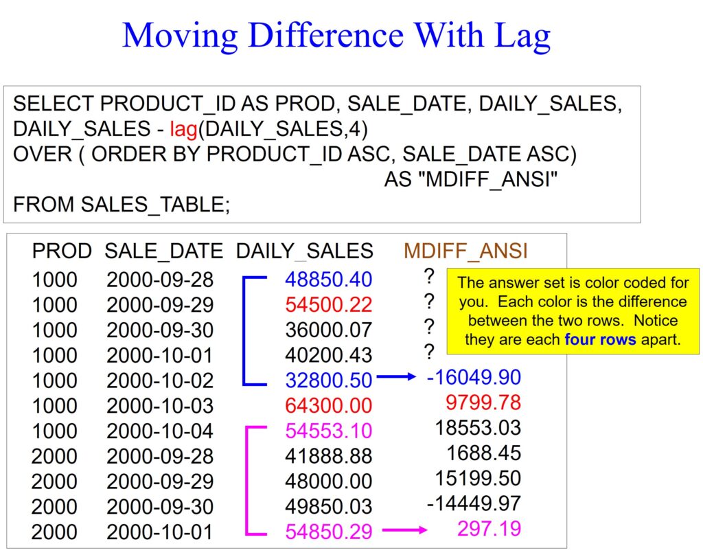 The example below performs the same moving difference calculation every four rows but uses the LAG command. Remember, both examples only compare the difference between the current row’s daily_sales and the daily_sales value four rows ahead.