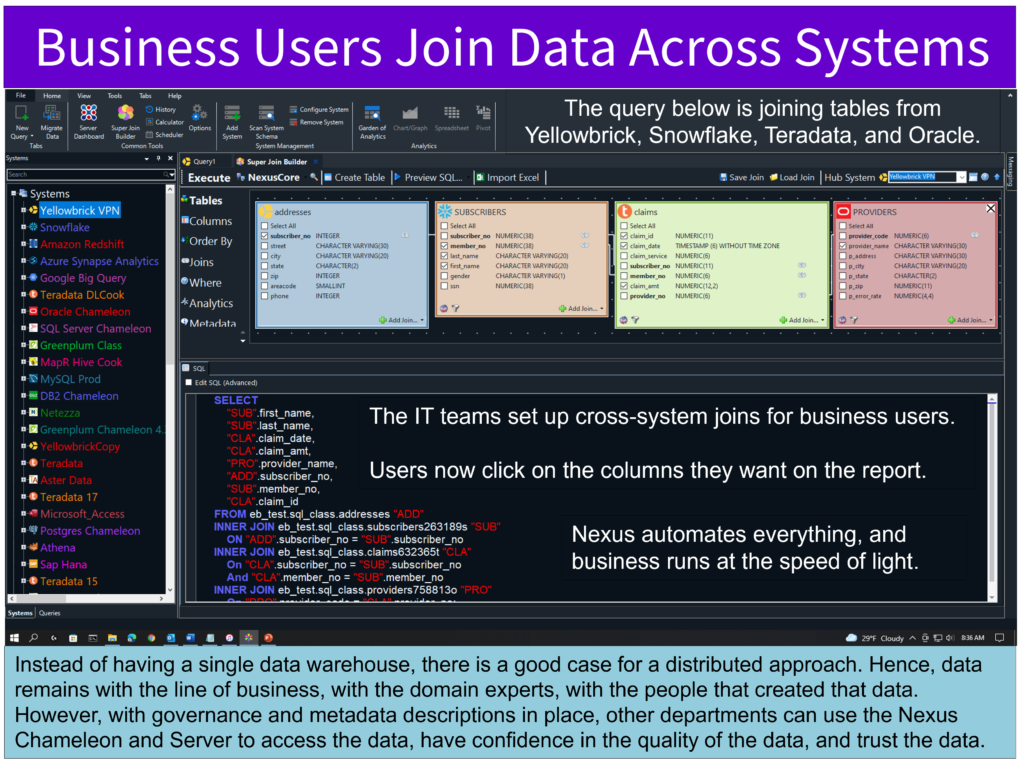 The salesperson’s next move is to mention, “The best property of their data warehouse is that users can join any data at any time across the board.”