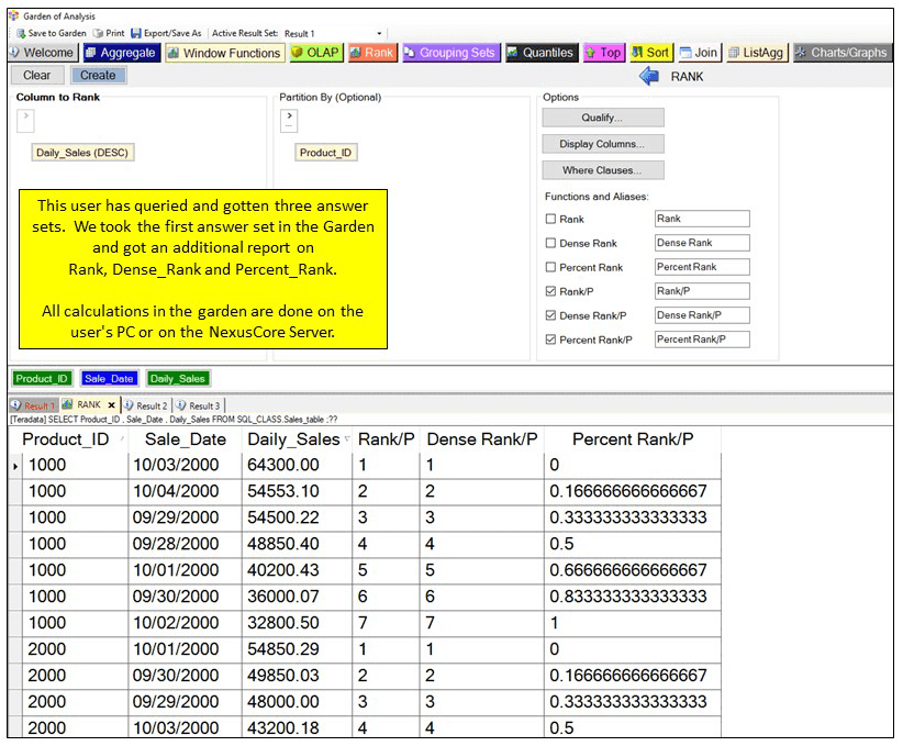 Now, the user has the option of querying systems from the Nexus on their PC and then manipulating answer sets in their local Garden of Analysis. They also have the option of letting the NexusCore Server run the query for them and returning only the answer set. Smaller sets of data run on the user’s PC and large sets run on the NexusCore Server. Both have the ability to perform analytics on answer sets.