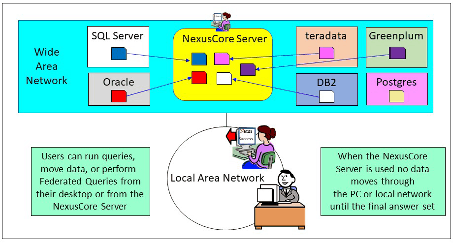That is when we decided to build the NexusCore Server. This would allow us to connect hundreds of Nexus user desktops to the NexusCore Server. The NexusCore Server makes it easy for the user to join tables of any size because the NexusCore Server does the join itself. It then sends the results back to the user. The NexusCore Server will even allow a user to choose which system they want to perform the join. You might have five Teradata tables joining to one table from SQL Server and one table from Oracle or DB2 or Netezza or Redshift. The user can tell NexusCore Server to run the join on Teradata and the NexusCore Server will move the SQL Server, Oracle, DB2, Netezza, or Redshift tables to Teradata, where the join is performed. The temporary tables are then dropped. Can you imagine the flexibility? Nexus can join tables from different systems inside the user’s PC, or on the NexusCore Server, or the join can take place on any system. Both Nexus or NexusCore can convert the tables structures, move the data, do the join and then drop the temporary tables. Wow!