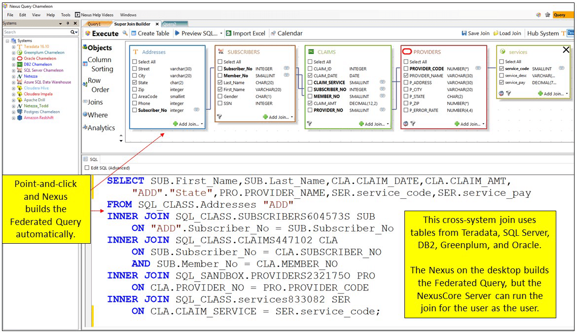 One of the most important functions that helped Nexus stand apart was the fact that we could join answer sets together from different systems (known as federated queries). The only real stumbling block was that originally, we couldn’t really join answer sets that had 10 million rows, but any answer set under a million rows joined easily to other answer sets.