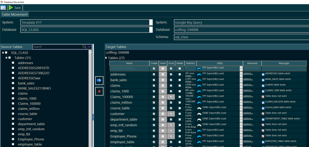 The picture below shows Nexus in dark mode migrating Teradata data to Google BigQuery. Some customers migrate thousands of tables to any cloud system in a single job.