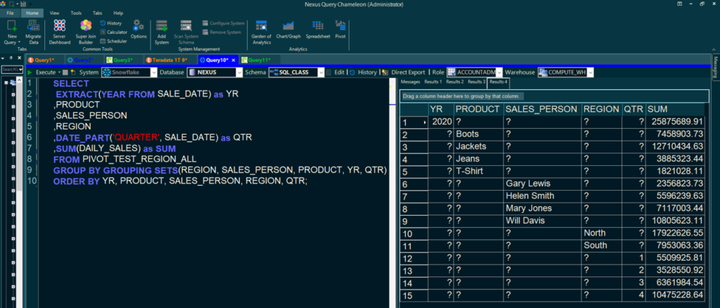 The picture below shows Nexus using an advanced Snowflake SET Operator technique to provide five different reports on sales data in a single report.
