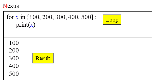 The example below is designed to show a “For” loop. The keyword ‘for’ causes the loop. For each value in the list of numbers, we are printing out each value line by line.