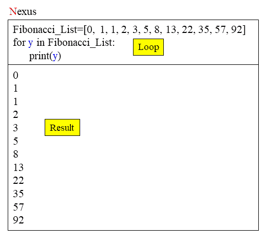 The example below is designed to show a “For” loop. The keyword ‘for’ causes the loop. For each value in the list named Fibonacci_List we are printing out each value line by line.
