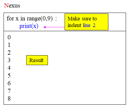 The example below uses a range between 0 and 8. Although it says 0 to 9, Python will go from 0 up to 8 and excludes 9.