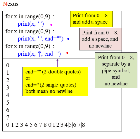 The example below uses a range between 0 and 8. Although it says 0 to 9, Python will go from 0 up to 8 and excludes 9. In our first range we print vertically, but in the other two ranges we print horizontally on the same line. Notice that our end = statement of either two double quotes or two single quotes eliminates a newline.