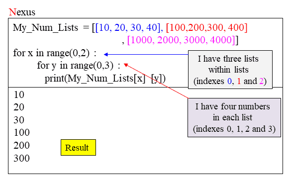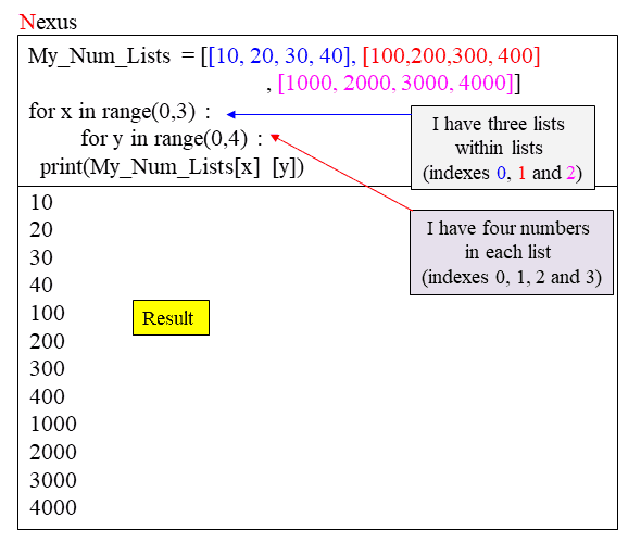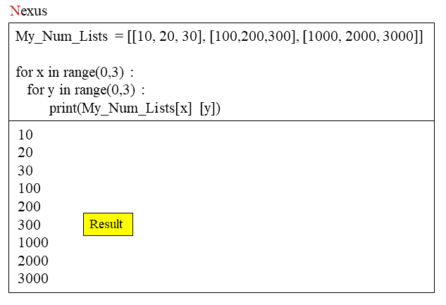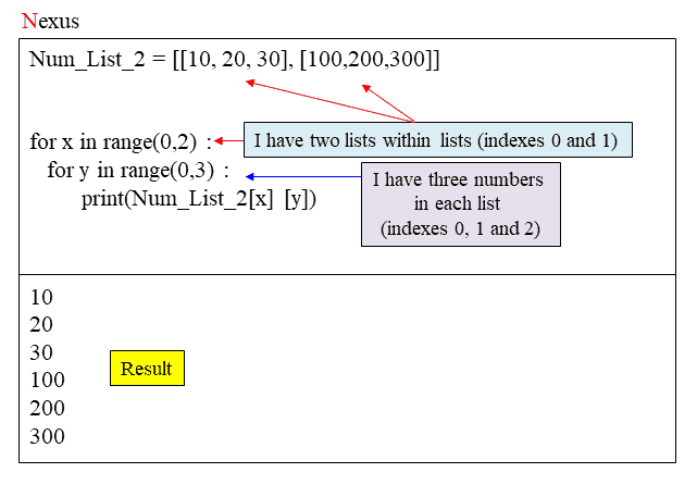 The example below is designed to show a “For” loop in greater detail. The keyword ‘for’ causes the loop and notice we have two for loops. This example tells Python that for x we have two lists in our Num_List_2 list. For y tells Python that in each list we have three numbers. We then print out [x] (both lists) and [y] (all three numbers per list.