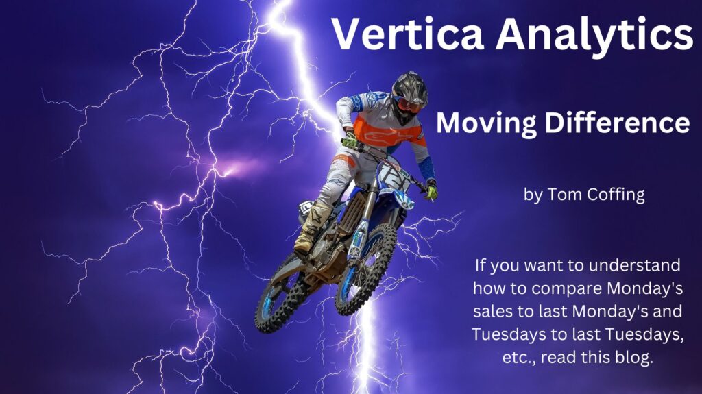 I can teach you analytics! Vertica is built for analytics, and this week, I will show you the amazing moving difference. The moving difference is one of the most incredible aspects of analytics, but it cannot seem very clear unless it is explained correctly. With power comes incredible responsibility. I won’t disappoint you.
