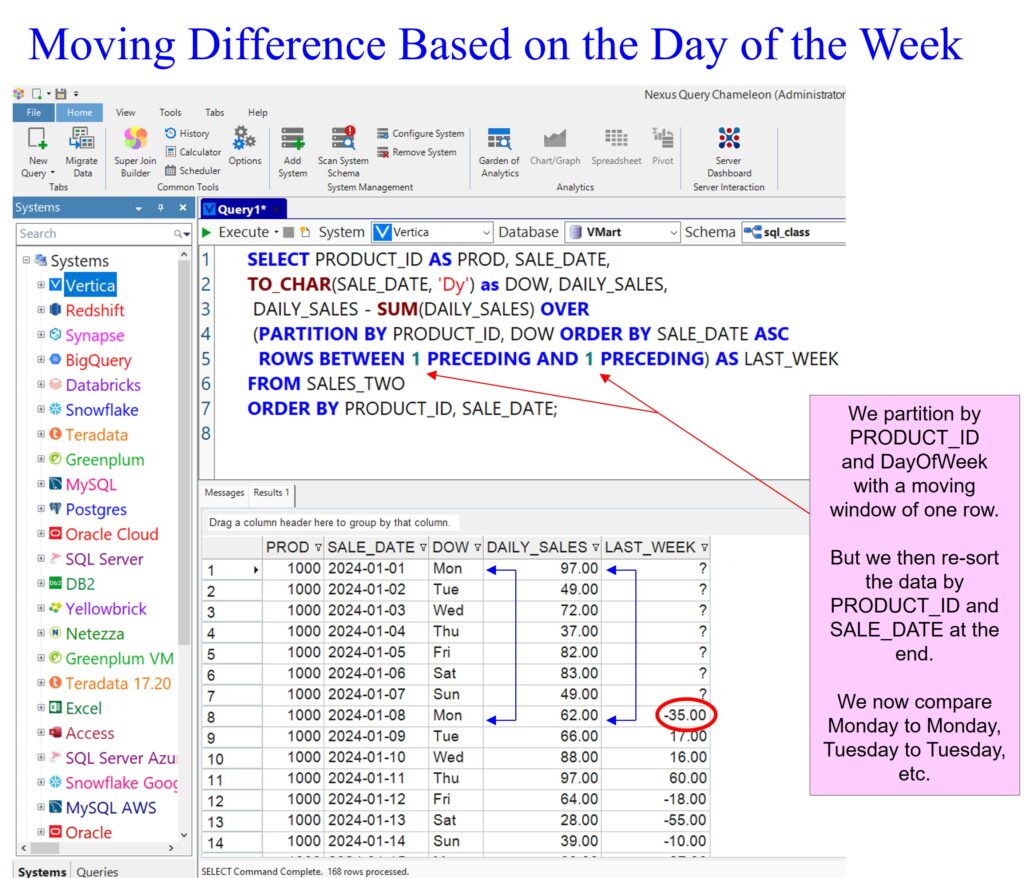 I use several tricks to ensure that this is perfect. The first trick is using the TO_CHAR command to format the sale_date to provide the day of the week, which I alias as dow. I then PARTITION BY product_id and dow to calculate the data by PRODUCT_ID 1000, and then all of my Mondays are ordered back to back. These are followed by all of my Tuesdays in a row. I then use a moving window of one because of the keywords ROWS BETWEEN 1 PRECEDING and 1 PRECEDING.
