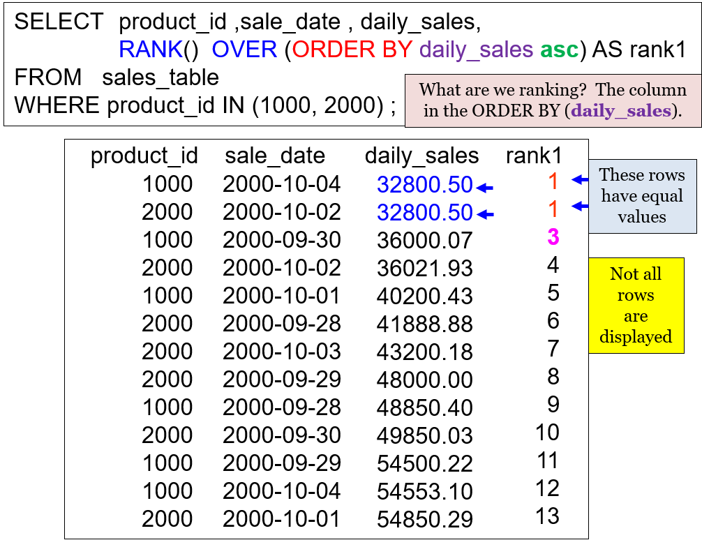 When you first see a RANK command with nothing in the parenthesis, you might have trouble at first and think, “What are we ranking?” Just check out the column in the ORDER BY statement, and that is what you are ranking. We have an ORDER BY daily_sales, so we are ranking by daily_sales.